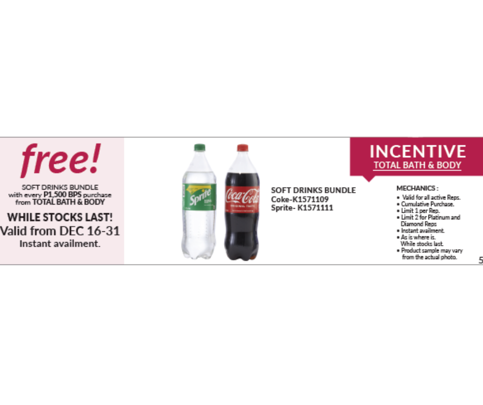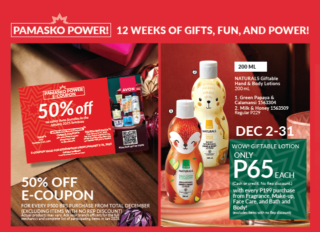 Get one (1) 50% OFF E-COUPON with every P500 BPS purchase from December 2024 brochure starting December 2-31, 2024 (excluding items with no Rep discount). Single P.O. Unlimited availment of E-Coupons.