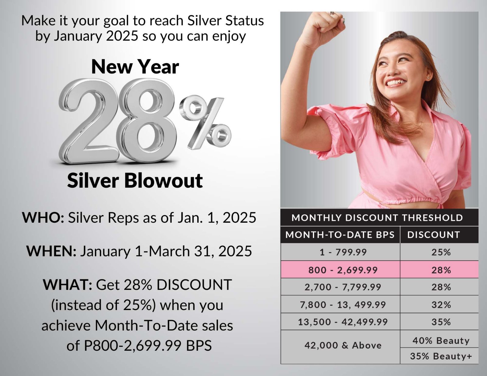 What: Get 28% DISCOUNT (instead of 25%) when you achieve Month-To-Date sales of P800-2,699.99 BPS.