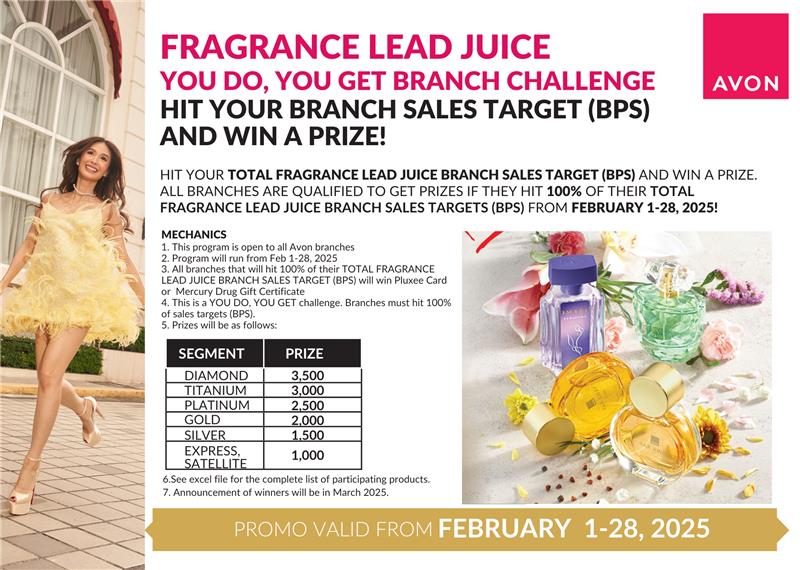 - All branches that will hit 100% of their TOTAL FRAGRANCE LEAD JUICE BRANCH SALES TARGET (BPS) will win Pluxee Car or Mercury Drug Gift Certificate