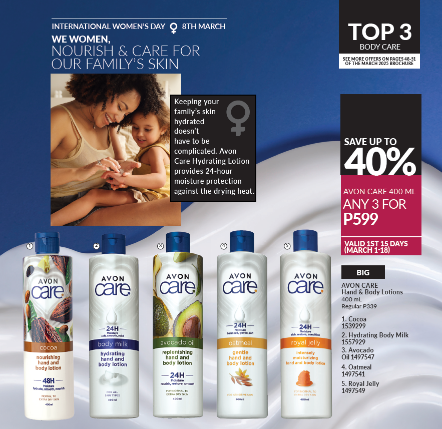 As the No. 1 lotion brand in the Philippines, Avon Care Hand & Body Lotions provide deep nourishment and long-lasting hydration—perfect para sa buong pamilya!